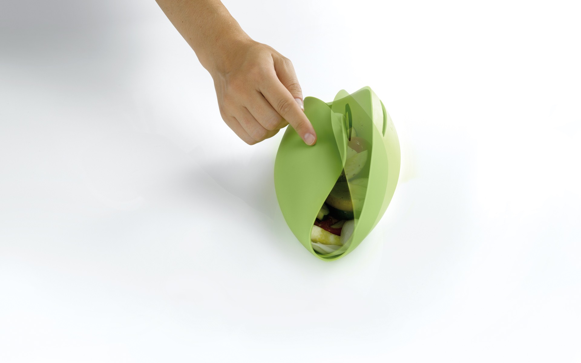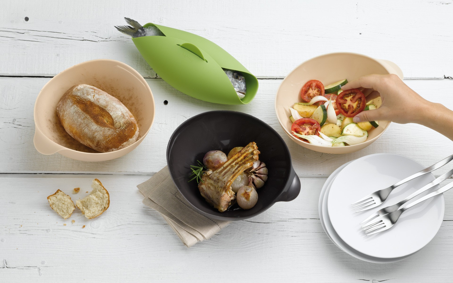 Además, una vez cocinado los ingredientes del interior del asador de silicona Lékué, al abrirlo con una simple presión, y con la precaución de no quemarnos con el vapor que tiene en su interior, obtendremos un singular bol que nos puede servir a la perfección para presentar el plato en la mesa.