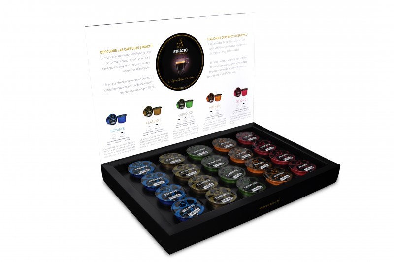 Además Stracto cuenta ya en el mercado con cinco variedades de cápsulas, con una dosis de 8 gramos de café cada cápsula, como son Descafeinado (Decaffe); tres mezclas (Clásico, Corporsso e Intenso); y un 100% Columbia (Delicato), todos ellos 100% Café Arábica.