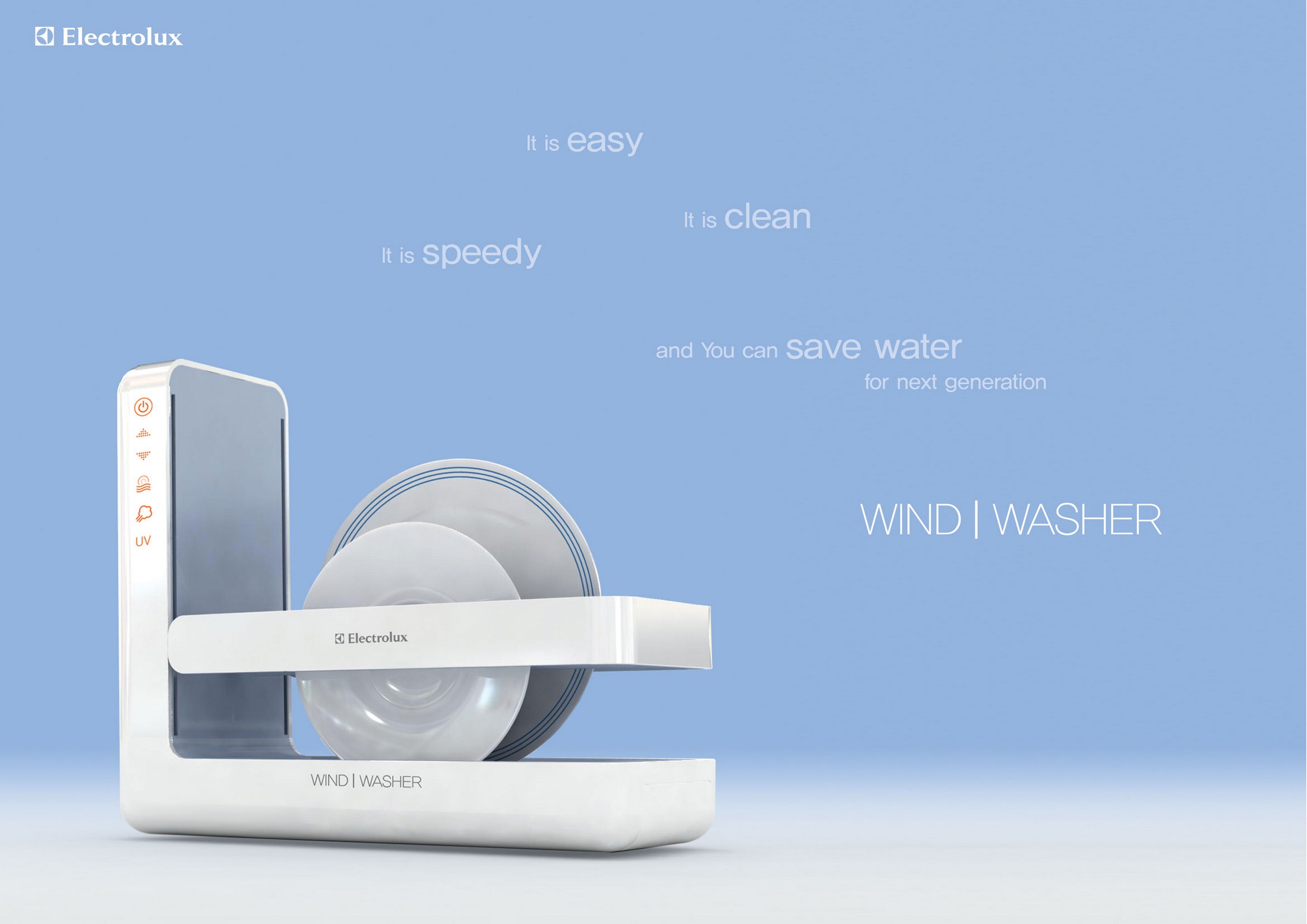 El «Electrolux Wind Washer» usa, en vez de agua, aire y rayos UV para la limpieza de los cacharros de cocina. Por lo visto este prototipo limpia en tres fases nuestros platos.