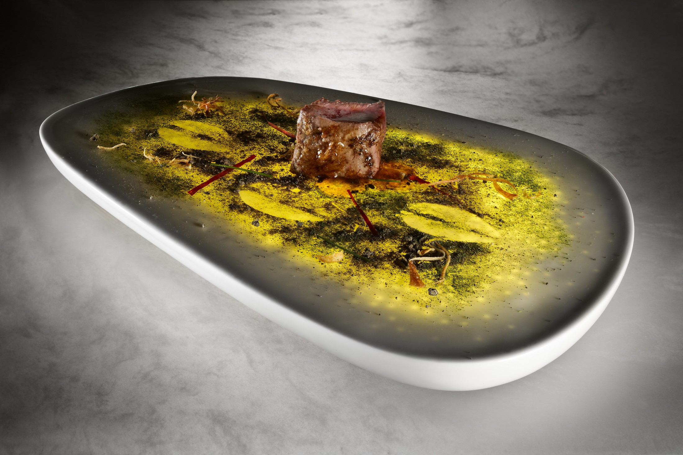 Al igual que el resto del auditorio, nos hemos quedado con la boca abierta con la serie de platos desarrollados por la gente de Philips Design Probes y las recetas del restaurante Arzak: Piedra Pómez la única piedra que flota (bol), Tótem y Tabú de Foie (plato largo) y Tras las huellas del corzo (plato para servir).