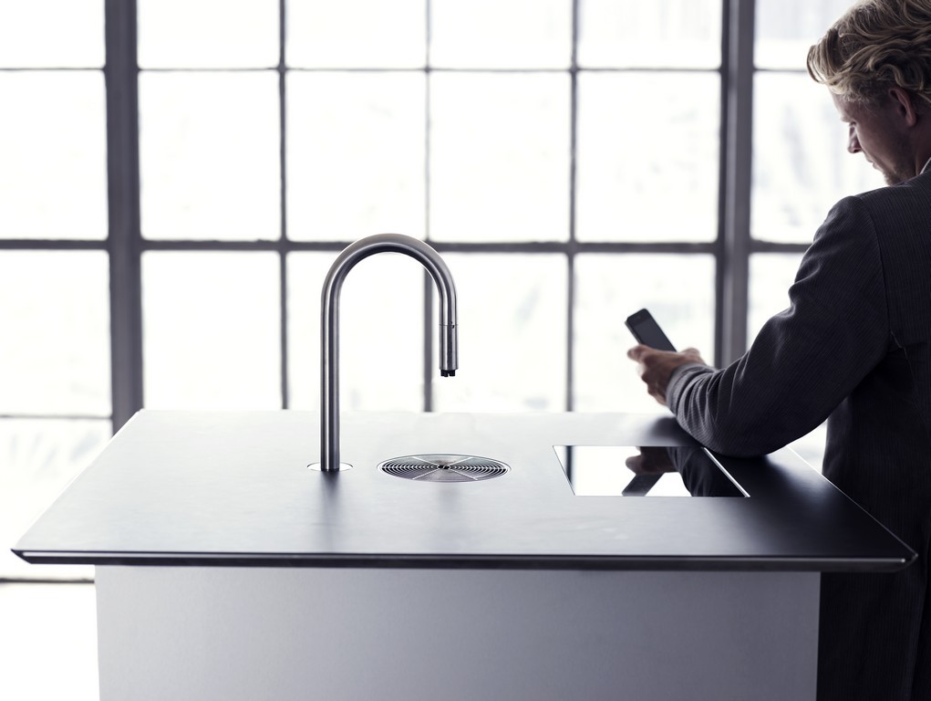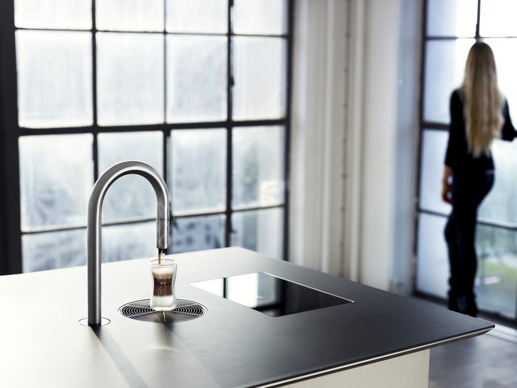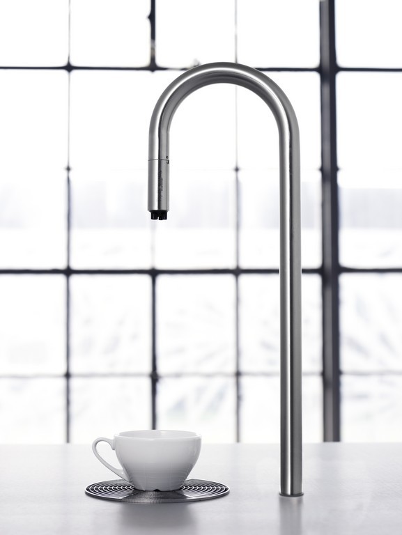 Para empezar la simplicidad de su funcionamiento y su pureza de líneas. El usuario solo ve un espectacular grifo de acero inoxidable (de altura ajustable) sobresaliendo majestuoso, como una escultura de la encimera.